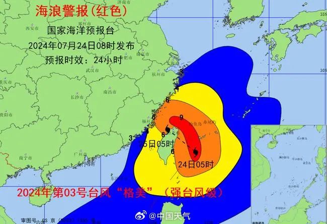 今天8时,国家海洋预报台发布海浪红色警报:受今年第3号台风格美影响,预计,7月24日中午到25日中午,东海南部、台湾以东洋面将出现6到10米的狂浪到狂涛区,台湾海峡将出现4到7米的巨浪到狂浪区,近海海域海浪预警级别为橙色;浙江南部、福建北部近岸海域将出现4到6米的巨浪到狂浪,该近岸海域海浪预警级别为红色,浙江北部近岸海域将出现3到5米的大浪到巨浪,该近岸海域海浪预警级别为橙色,福建南部近岸海域将出现3到4米的大浪到巨浪,该近岸海域海浪预警级别为黄色。