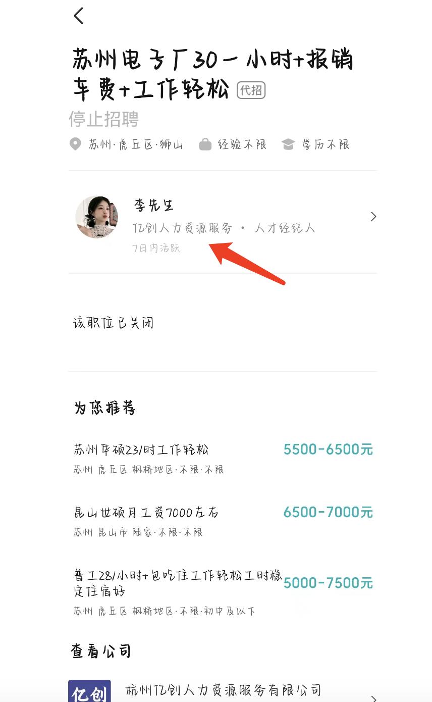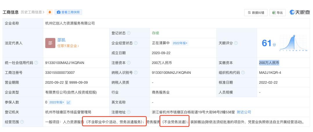 蓝鲸新闻记者查询发现,蹦蹦在招聘平台联系的公司名为亿创人力资源服务,全名为杭州亿创人力资源服务有限公司。