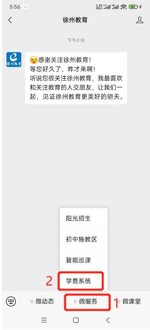 使用微信搜索公众号【徐州教育】,选择[微服务]----[学费系统]。该收费系统仅用于收取市直属公办高中阶段学校学费、住宿费、幼儿园保育教育费等,具体费用金额请以学校通知为准。