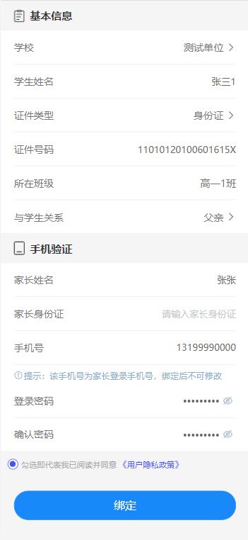 填写完所有必填信息后,勾选用户隐私政策,点击绑定按钮,完成绑定。