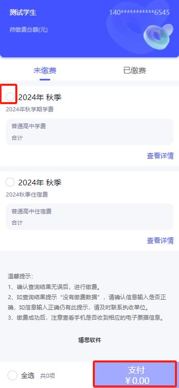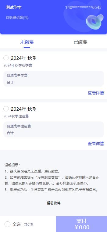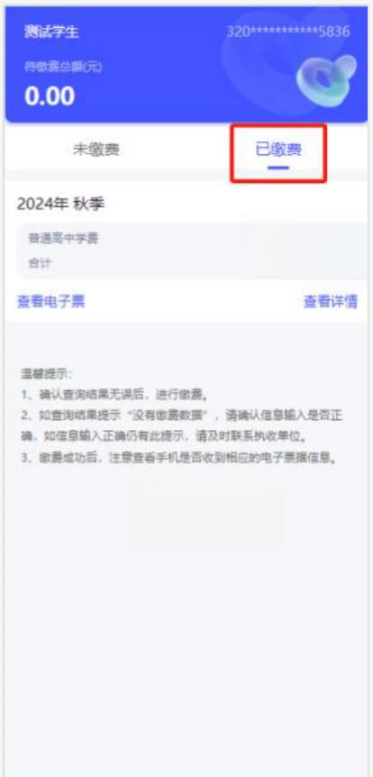 点击缴费页面中【已缴费】菜单,可查询所有的历史缴费记录和电子票据。