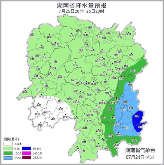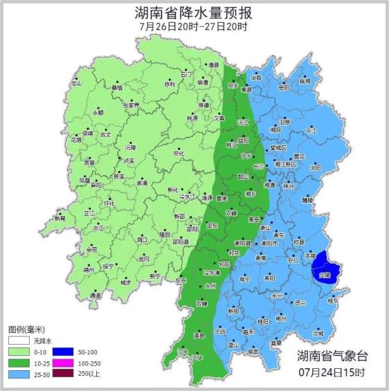 25日晚上到26日白天,湘东多云转中到大雨,其中株洲(炎陵)、郴州(资兴、桂东)有暴雨,其他地区多云,大部分地区有阵雨或雷阵雨;湘东北风4~5级,其他地区北风2~3级,江河湖面风力可达6~7级;最高气温湘西36~38℃,其他地区34~36℃;最低气温26~28℃。