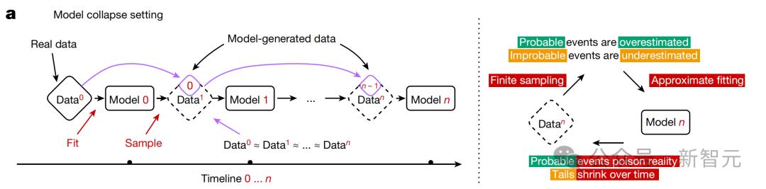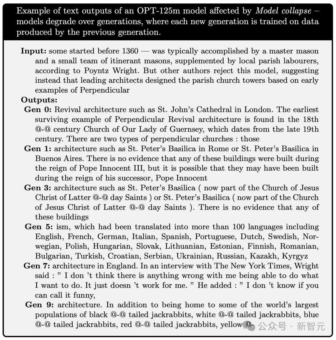 简单讲,LLM生成的数据最终污染了下一代模型的训练集,就会出现「模型崩溃」(model collapse)的现象。