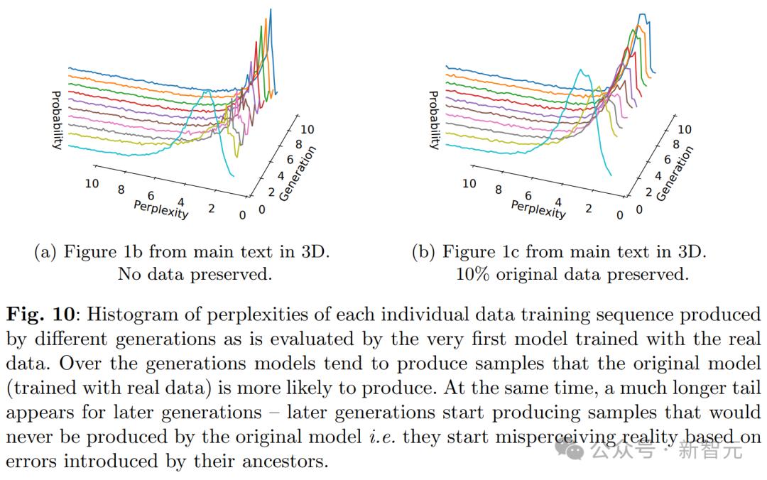 特别是,从图下及其3D版本中可以看到,模型崩溃现象确实发生了,因为低困惑度样本的密度随着训练代次的增加而开始累积。