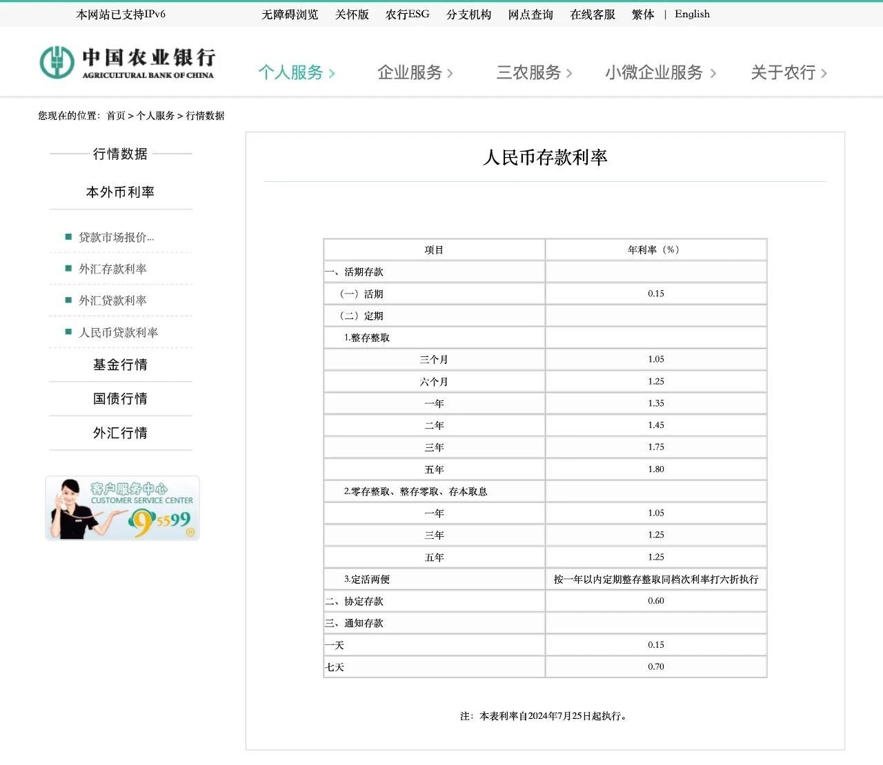 中国农业银行官网显示,农行于7月25日下调了人民币存款利率,其中定期整存整取三个月、半年期、一年期利率均下调10个基点,分别为1.05%、1.25%、1.35%;二年期、三年期、五年期利率分别下调20个基点,至1.45%、1.75%、1.80%。