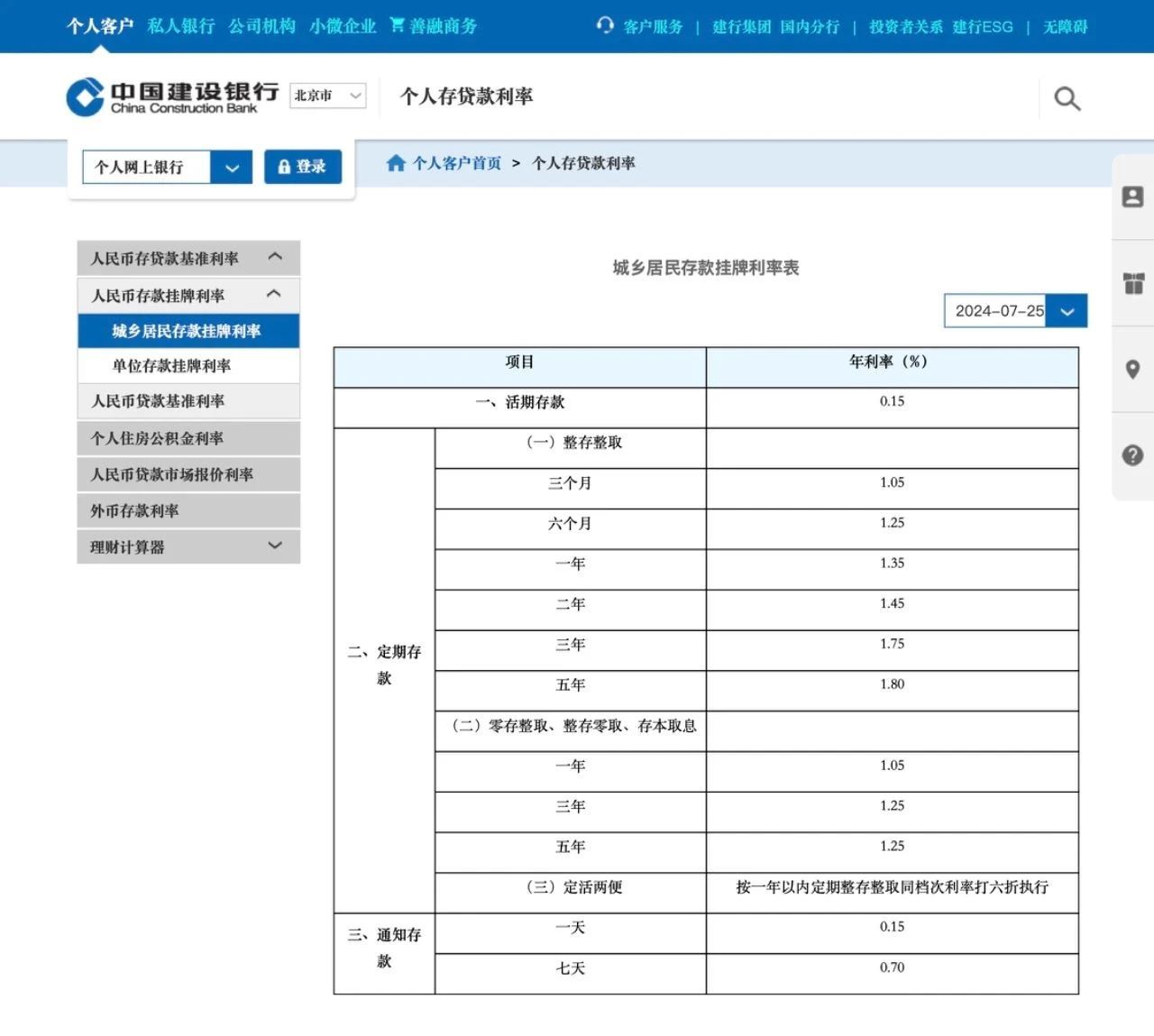 中国建设银行下调人民币存款利率,其中活期下调0.05个百分点;整存整取1年期及以下下调0.1个百分点;2年期及以上下调0.2个百分点。零存整取、整存零取、存本取息各期限利率下调0.1个百分点。
