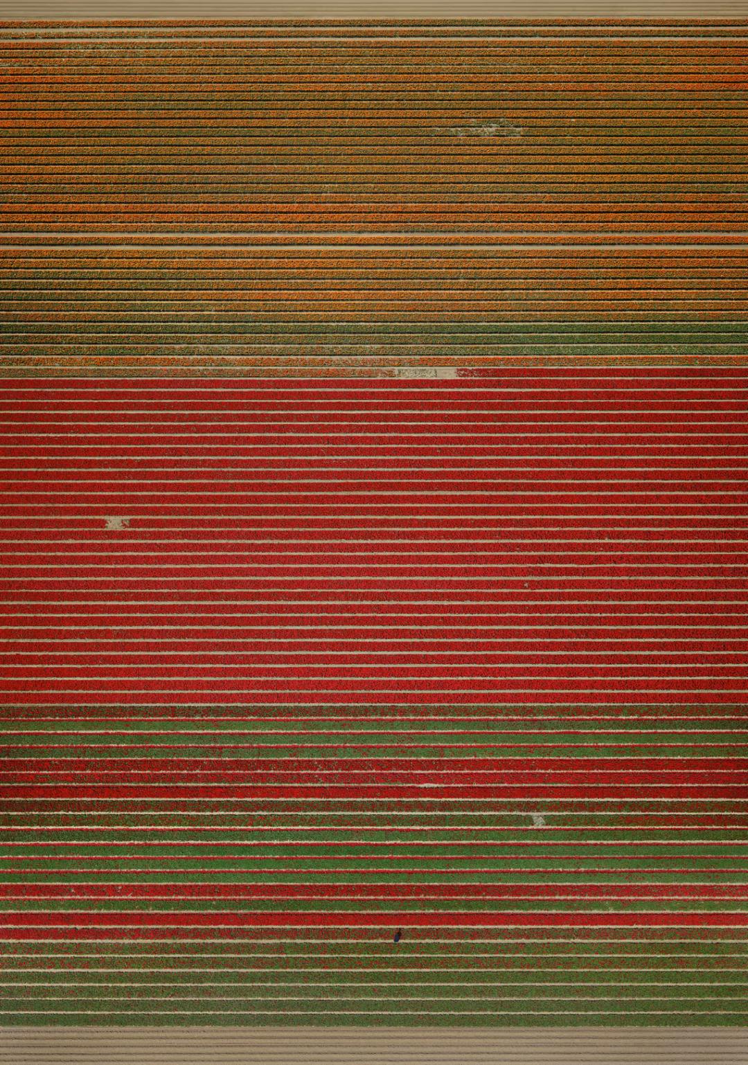 仿佛预料到了问题,古斯基表示他已经将这类照片抛之脑后,“我对奇观的兴趣已经成为过去,我当下的图像中没有这类元素。”此后,他制作了其他的系列作品,如《海洋》(2010),其素材来源于卫星图像,并继续定期地补充《无题》系列。该系列诞生于1993年,始于最基础和抽象的图像:如一块普通的灰色地毯。最近,《无题18号》(2015)等作品似乎从20世纪中期的色域绘画中获得了启示——粉色或红色,绿色和灰色的水平带状图案,仔细观察,原来是一排排小小的郁金香花朵:为全球市场而大规模种植的。我好奇他从哪里找寻得拍摄题材。“我是一个每天都热衷于读报的人,所以我的很多想法都源于报刊,或杂志和电视,所以这就是为什么我的图像与世界上正在发生的事情息息相关。”他的近期作品似乎更明确地聚焦于当下问题:《埃尔埃尔希多》(2017)——布满垃圾的西班牙高速公路一侧,延绵数英里的“塑料农田”。《莱梅》(2016)——法国一处由棕色矩形面板组成的巨大太阳能发电厂;还有《亚马逊》(2016)——令人震撼的公司仓库内部景象,存放着成千上万本书。(在近距离观察中,你可以研究按照算法而非任何传统分类方式排序的复杂系统。)