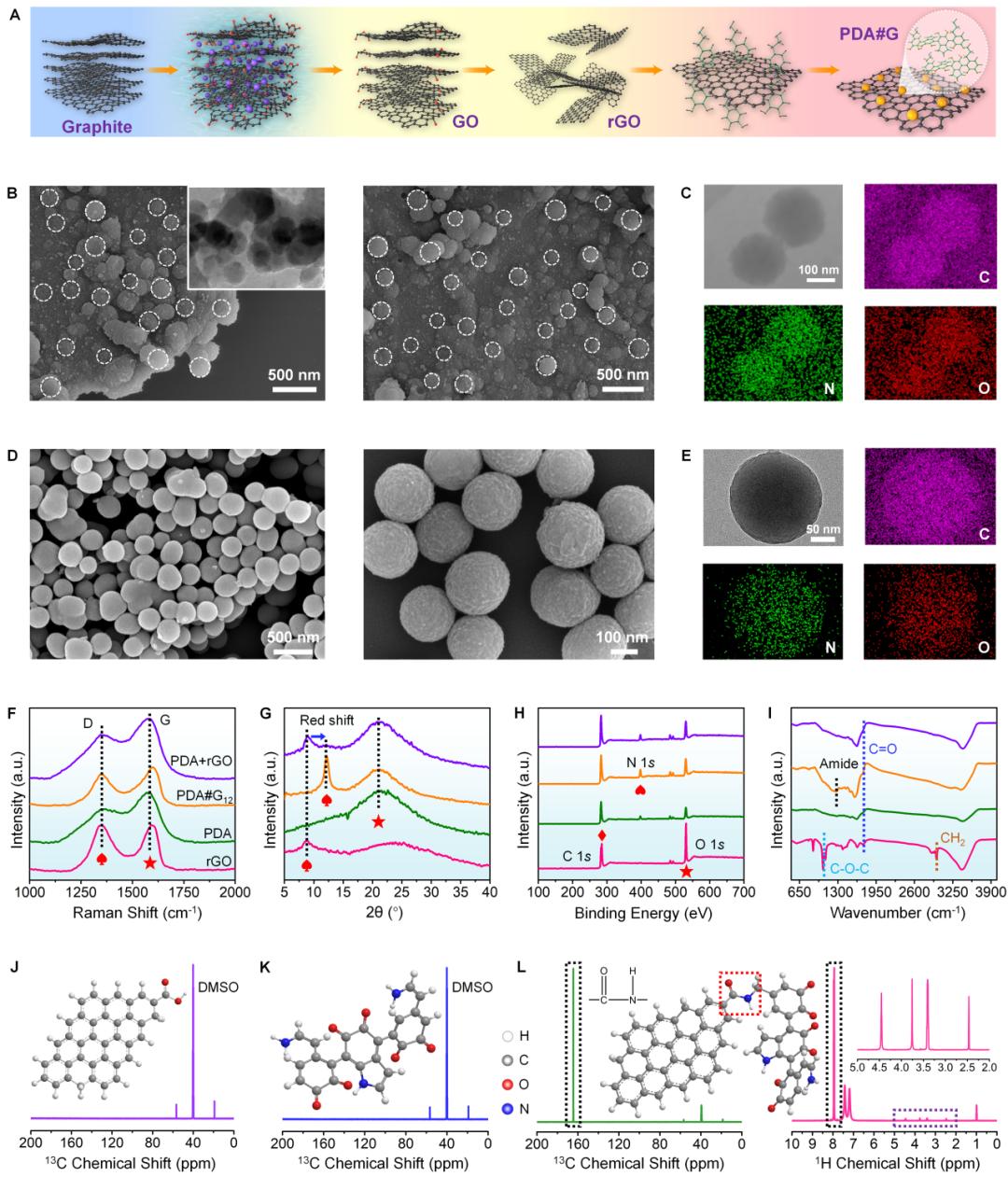图1 聚多巴胺修饰的石墨烯材料形貌及理化特性。