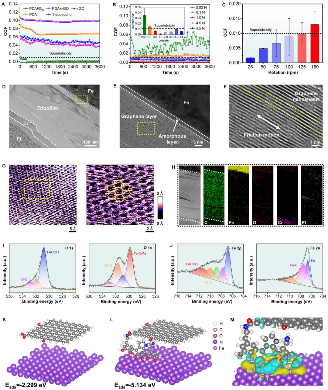 研究人员将制备得到的PDA#G12复合材料分散在1-十二烷醇润滑介质中,并在Hertz接触应力为329~685 MPa的条件下实现宏观超滑现象。同时,在磨痕表面生成厚度达到480 nm的石墨烯晶态边界润滑膜。其中,PDA纳米微球一方面与石墨烯发生脱水酰胺化共价反应,另一方面与对摩副表面的FeOOH发生多价螯合脱水相互作用,从而显著增强石墨烯在磨痕表面的共价吸附能力。