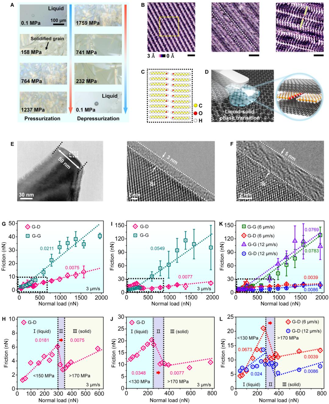 研究人员通过金刚石对顶砧设备发现,室温条件下1-十二烷醇液体在压力达到141 MPa左右时会发生液-固相转变行为,由液相转变为固相,且这种液-固相转变是可逆行为。同时,固相1-十二烷醇分子层通过羟基之间形成氢键,自组装形成“鱼骨”状排列形式。此外,研究人员通过AFM微观摩擦学实验证明,当相变结构超滑现象发生时,界面的剪切面发生在晶态边界润滑膜与固相的1-十二烷醇分子层之间。