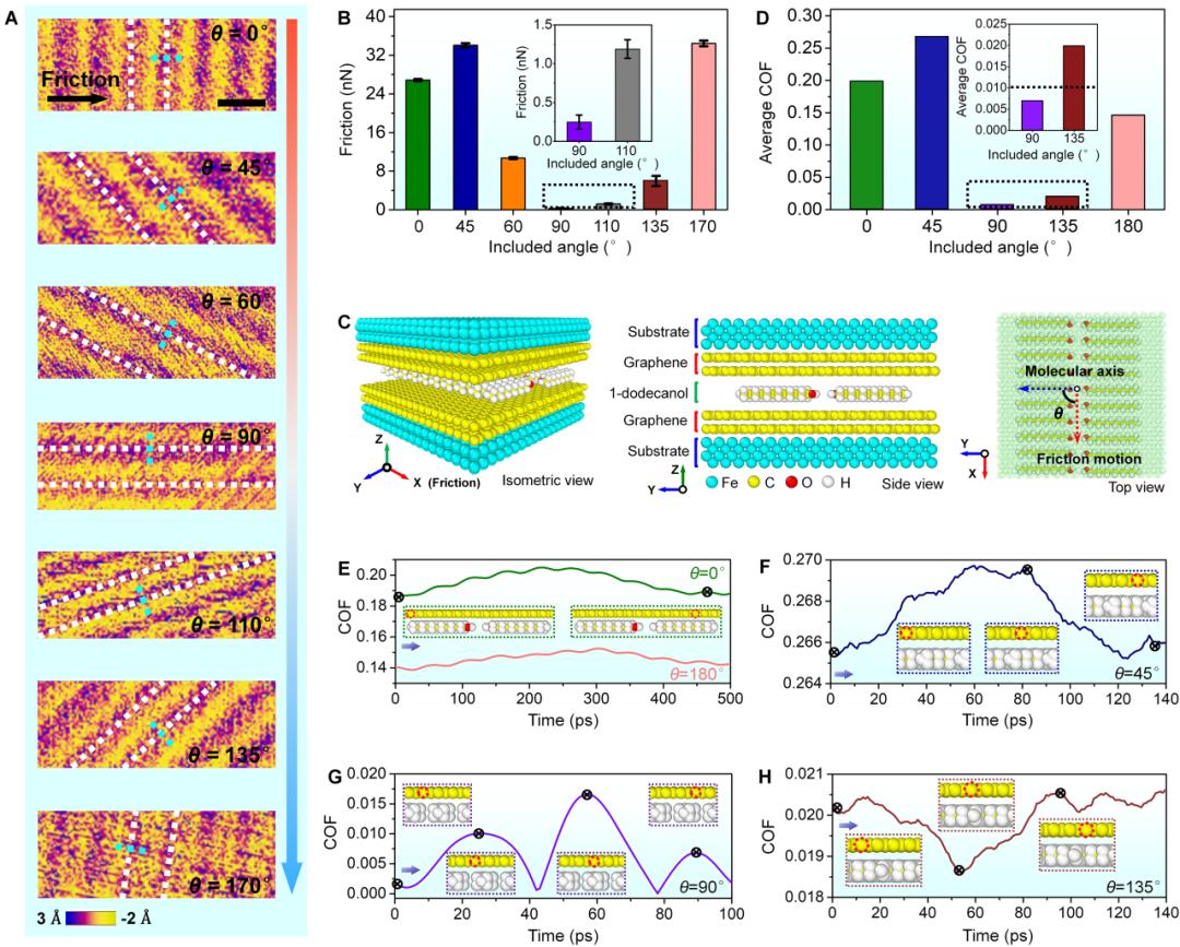 进一步地,研究人员通过AFM微观摩擦学实验和分子动力学模拟计算结果证明,原位异质结的摩擦行为具有180º周期性特征,且当1-十二烷醇的分子轴线方向与摩擦运动方向夹角为90º时,相变结构超滑现象出现。相变结构超滑发生的理论判据:(ⅰ)摩擦界面形成晶态边界润滑膜;(ⅱ)压力诱导1-十二烷醇发生液-固相结构转变。