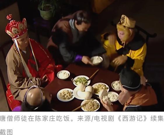 第九十六回,唐僧师徒来到寇家庄,寇员外宴请时曾描述,“前面是五色高果,俱巧匠新装成的时样。第二行五盘小菜,第三行五碟水果,第四行五大盘闲食。般般甜美,件件馨香。素汤米饭,蒸卷馒头,尽皆可口,真足充肠。七八个僮仆往来奔奉,四五个庖丁不住手。你看那上汤的上汤,添饭的添饭。一往一来,真如流星赶月。这猪八戒一口一碗,就是风卷残云”。