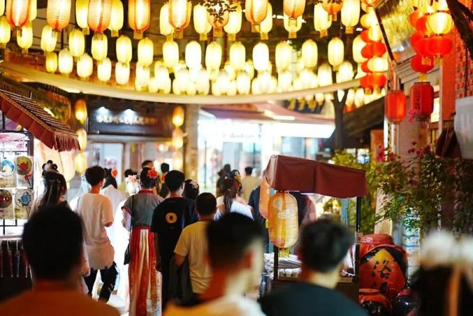 龙门石窟景区灯火通明的古城街道,