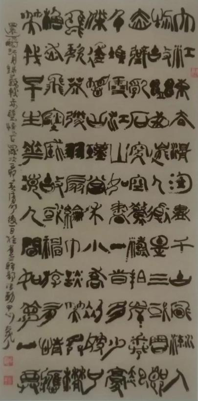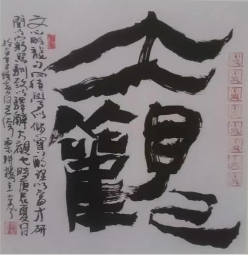 当我们全面审视郝国良先生的书法创作时,发现他写二㸑只是冰山一角,其实他的涉猎与创造显得比他写二㸑更有观赏性,尤其到了七十岁以后,临池更加广泛,从两汉上溯到前秦的各种篆书,金文、石鼓、甲骨文甚至鸟篆一类,线条的丰富性和结体的通变性,都取得了令人赞叹的艺术水平。线条的变化与形体的重新组合是现代书法创作的一个特点,难度很大,郝国良先生迎难而上,刻苦临池,大胆创新,在甘肃书法界独树一帜,成为现代书法创新的典范。