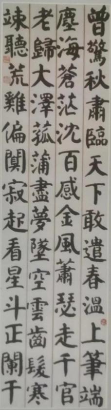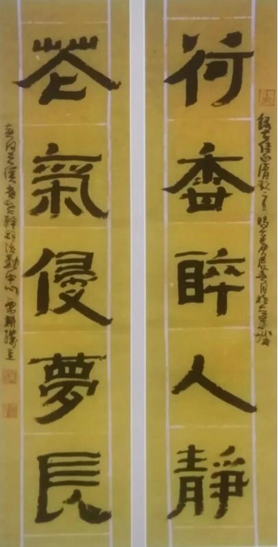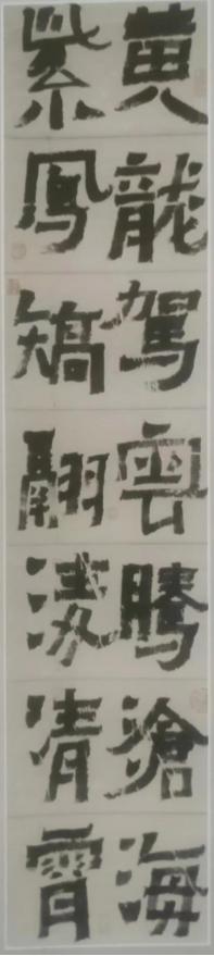首先,他自幼学习颜体,根是正的。初学唐楷,几乎是每一位书法学习者必经的启蒙教育。不过取法有别,或学欧体,或学柳体,或学赵体(元),时间的长短因人而异。随着年龄的增长,人们有了不同的取舍。郝国良先生果断地舍去颜体,转向两汉碑刻,在这个领域里下过一番苦功,取得了可喜的成绩,我们从他创作的《联句:荷香醉人静,花气侵萝长》和《魏徵:善始者实繁,克终者盖寡……》等作品之中可见其功力所在。后来他毅然转向《二㸑》,写出了他独特自由的风趣,得到了书法界的公认,如《诗一首:立马风陵望汉关……》《联句:黄龙驾云腾沧海,紫凤矫翮凌清宵》等作品。关于这一点,我想起了王阳明先生的一句话:“不在人所共知处用功”,郝国良先生就是在人们皆不关注的地方用功,取得了事半功倍的效果。记得清代的书法家郑簠,当人们都在学习赵孟頫的时候,他却专攻汉隶取得了重大突破,被称为清代隶书第一人,对后来的金农、郑板桥、桂馥等人都有影响;郑簠移步换形,另起锅灶,取得了成功。郝国良先生是具有智慧的当代书法家,他既能洞察评委们“猎奇”的心理状态,又能展现自己与众不同的艺术风貌。