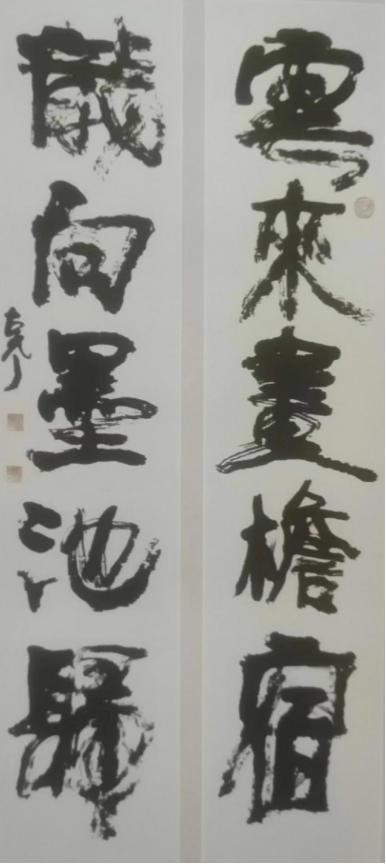 郝国良先生的取舍是成功的,他对古拙之风有着强烈的偏好,这种偏好没有影响他的创作思路,而是增加了他的主体意识。学习二㸑先是他的主攻方向,后来成了他创作的参照,创作了许多与二㸑体式不同的艺术风格,他把这种古拙的风格普及到各种书体之中,其篆书、隶书、行书、草书皆有显著的特点,如行书《联句:云来画檐宿,龙向墨池归》,斗方榜书《龙》,行草书《联句:满庭诗境飘红叶,绕砌琴声滴暗泉》等作品,不尽古拙,更显示出苍劲老辣的笔墨气势。