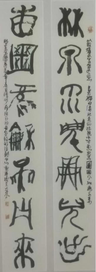 郝国良先生具有甲骨笔意的《古诗词》书法创作,确是一幅随意、爽朗、风趣多变的上乘之作,运笔提按跌宕,线条粗中有细,结体机变有序,整篇章法大小相间,方圆兼施,疏密得当,斜正相倚,古拙朴茂,浑然一体;释文落款以颜体行书为基调,风趣烂漫,自然连贯,与正文妙配,相得益彰。此类作品还有《联语:林泉雨毕鱼儿出,圃囿风和燕子来》,这副对联线条丰富,结体章法机变古朴,配有随意自在的小字,确有令人感叹之妙境!他有时用冷僻、深奥的古体字和异体字,使作品表现出苍劲拙朴的深邃古意。