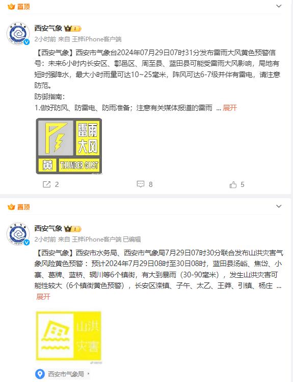 预计2024年7月29日08时至30日08时,蓝田县汤峪、焦岱、小寨、葛牌、蓝桥、辋川等6个镇街,有大到暴雨(30-90毫米),发生山洪灾害可能性较大(6个镇街黄色预警),长安区滦镇、子午、太乙、王莽、引镇、杨庄等6个镇街,蓝田县九间房、灞源、厚镇等3个镇街,中到大雨,局地暴雨(25-80毫米),可能发生山洪灾害(9个镇街蓝色预警)。