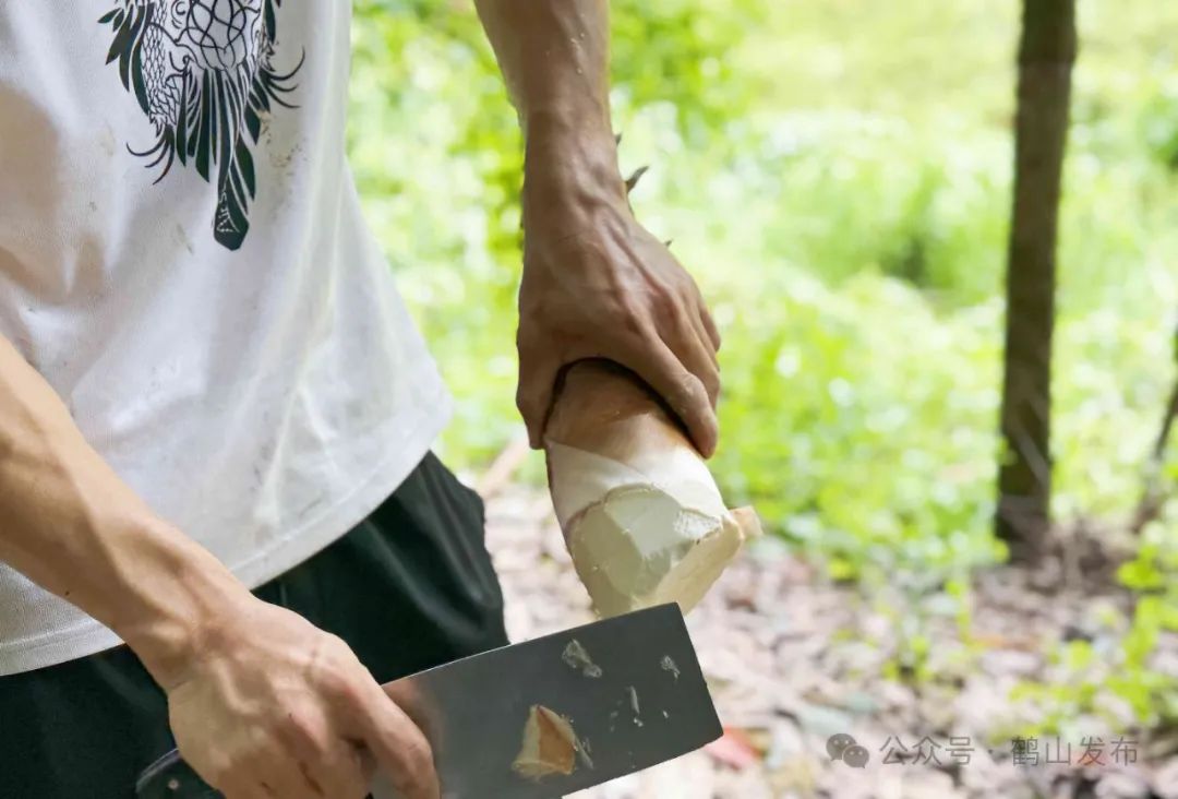 水果竹笋场负责人魏文彬每天一大早都会采摘新鲜竹笋。挖出一支完整的笋也是一门技术活。魏文彬先把笋周围的泥土轻轻挖开,露出笋的根部,左手扶住笋尖,右手拿刀一点一点撬动笋的根部,再轻轻一摘,一只完整的竹笋就被取了出来。