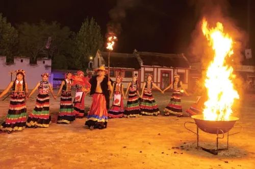 夏夜寻欢,精彩正酣,九顶塔夜场也已开启。泼水狂欢,点燃夏夜激情;民族风情,是夜晚的多彩画卷;香格里拉晚会,唱响了遥远的呼唤;火把节的热烈,照亮了夜的深邃;火龙钢花,在夜空下绚烂盛开;篝火旁,火光摇曳,围炉共舞……九顶塔夜游盛典,带你领略民族艺术的独特魅力,畅享视觉与味觉的双重盛宴。