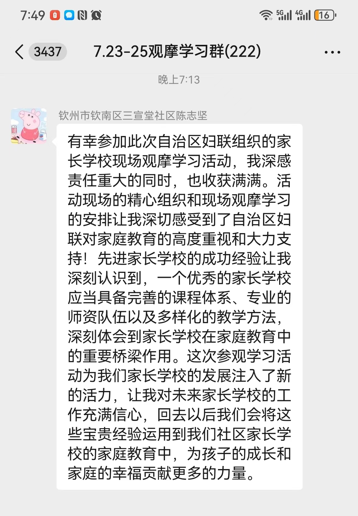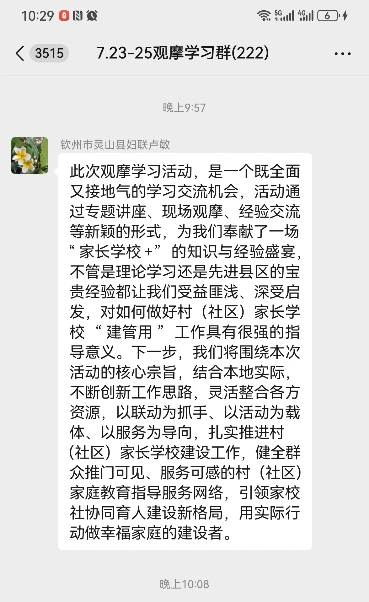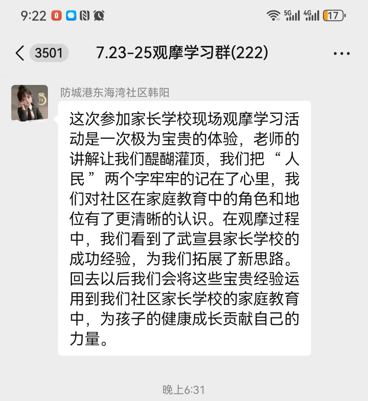 大家表示,通过两天的观摩学习,对家庭教育工作有了更深刻的理解、对推进社区(村)家长学校建设工作有了更清晰的思路,对提升家庭教育指导服务工作水平有了更充足的信心。活动结束后,大家反响热列,纷纷留言谈收获和体会。