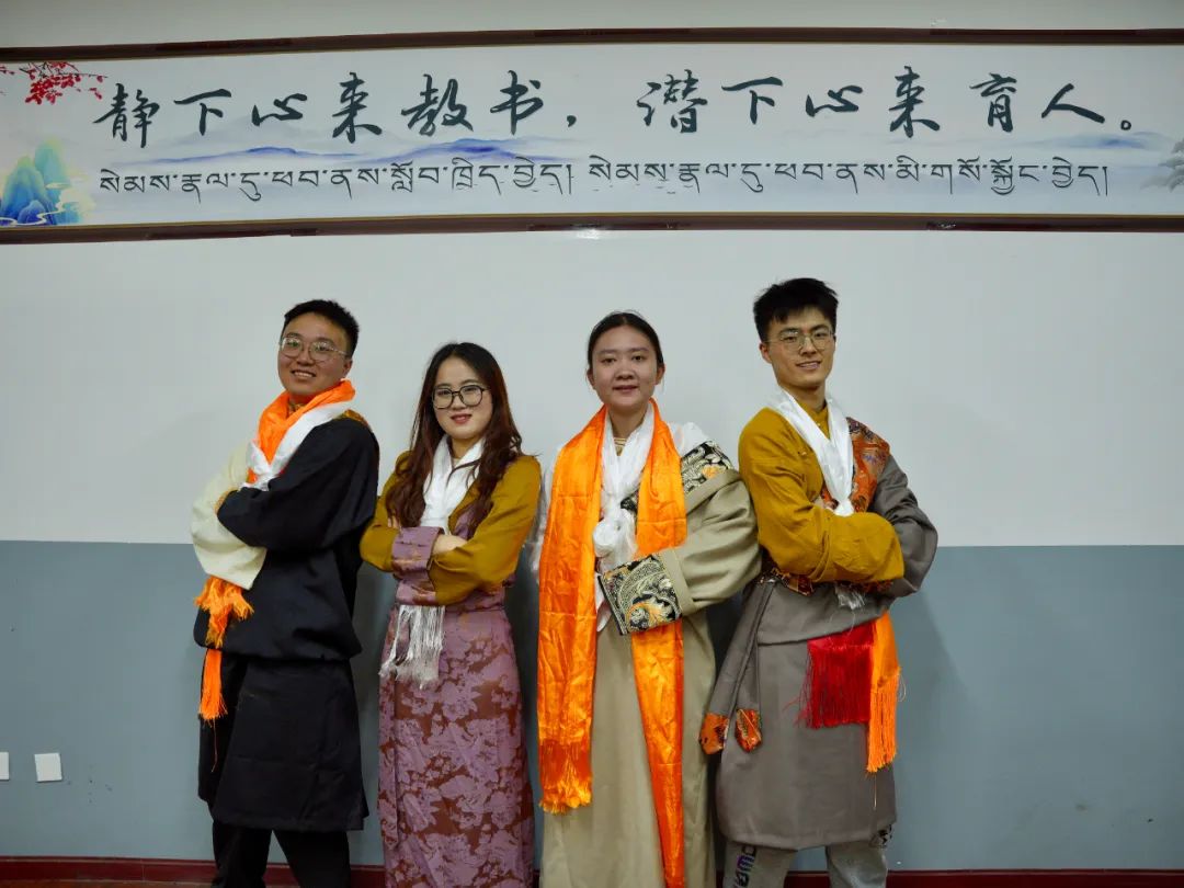 郑镕昊、赵晨旭、李双陆、赵芷晴藏装合照郑镕昊担任分队队长,接过分队大旗时,他感受到沉甸甸的分量。“这是嘱托,更是责任,”这个00后小伙子说,“我想不能辜负学校的信任,我们一定要为藏区孩子做些什么。”为藏区孩子做些什么,这一句话,他们四人用实际行动贯彻在整个支教生涯。火车驶过茫茫戈壁,翻越皑皑雪山,在祖国西部疾驰,一路来到了日光城拉萨。窗外的植被逐渐稀疏,他们心中的热血却不断升腾。“刚来藏区非常激动,我们都是第一次来高原。真想立刻到学校,投入教学工作。”分队成员李双陆说。在拉萨接受7天培训后,他们又戴上人生第一条哈达,乘着夜色来到康巴腹地昌都。在昌都市党校进行了7天培训后,这才来到服务地昌都市第六高级中学。