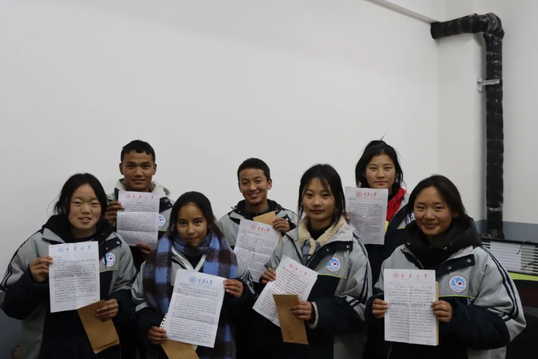 俄洛镇的村庄2023年9月,昌都团市委举办了一场书信交流活动,昌都市第六高级中学、沙坪坝滨江小学的学生们互通书信。“当我在班上公布时,大家都很积极。”分队成员赵晨旭说,“但可惜名额有限,很多孩子没有机会写信。”她与三名队友暗下决心,一定要让每个学生都有机会写信、回信。2023年11月,昌都分队联合重庆大学团校、绿能筑梦团支部,组织了“渝暖藏冬,信语心言”书信活动,1100封充满鼓励与祝福的信件顺着长江溯流而上,来到了昌都六高学生们手中。“活动的反响超出我们的想象,”赵晨旭说,“孩子们深受鼓舞,迫不期待提笔回信,甚至主动录制视频感谢重庆大学哥哥姐姐。他们的眼里有光。”眼里有光的还有这四位年轻的00后老师,他们开始认真思考,如何做一些真正有意义的活动,帮助到藏区孩子们。