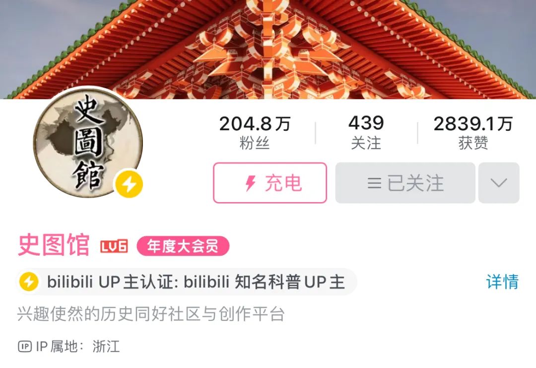 “兴趣使然的历史国风同好社区与创作平台”,是历史科普新媒体「史图馆」的B站账号简介。