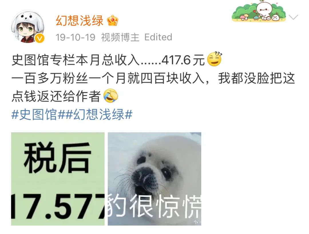 早期的B站,不仅没有三连创作激励,连广告都非常少,所以「史图馆」的变现几乎为零。后来情况好了点,但依然远远谈不上赚钱,当然我们也并不是很介意这个。