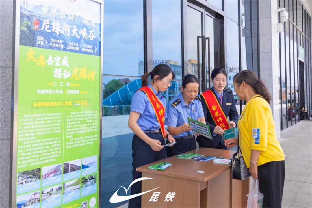 为方便旅客领取,宣威站工作人员在进站口向旅客发放门票优惠券,同时在出站口也设置了优惠劵发放点。工作人员主动向旅客介绍尼珠河大峡谷景区基本情况和交通方式,还准备了打卡明信片,让旅客对景区有更多了解。