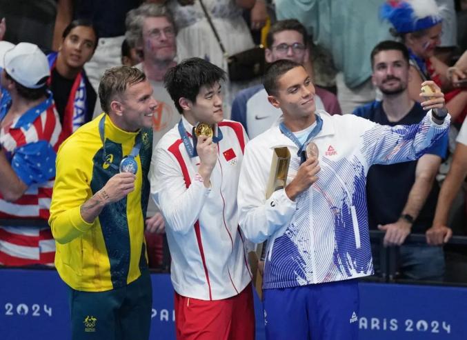 冠军中国选手潘展乐(中)、亚军澳大利亚选手查默斯(左)与季军罗马尼亚选手波波维奇在颁奖仪式上。新华社记者 雒圆 摄