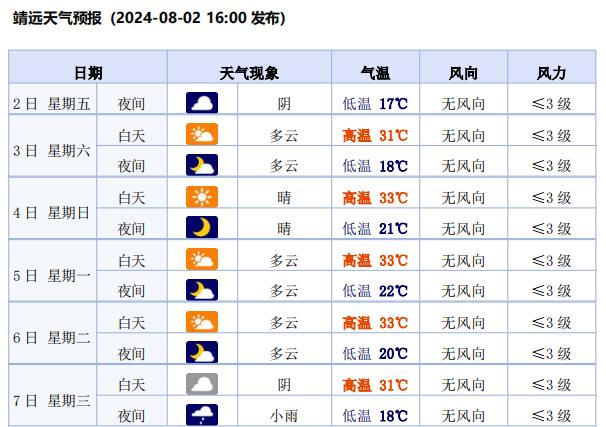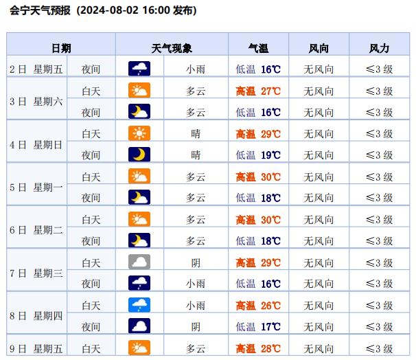 预计,2日夜间我市会宁县大部有小雨天气;8日我市大部有小雨天气,中南部局地有中雨。未来一周其余时段,我市以多云天气为主。具体预报如下: