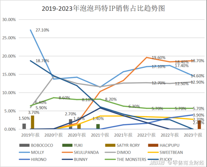 数据显示,近年来,MOLLY和PUCKY的影响力正在逐渐下降。深层次的原因是,没有内容支撑的形象IP只能达成“短期”的业绩使命,难以展露更长期的商业价值。