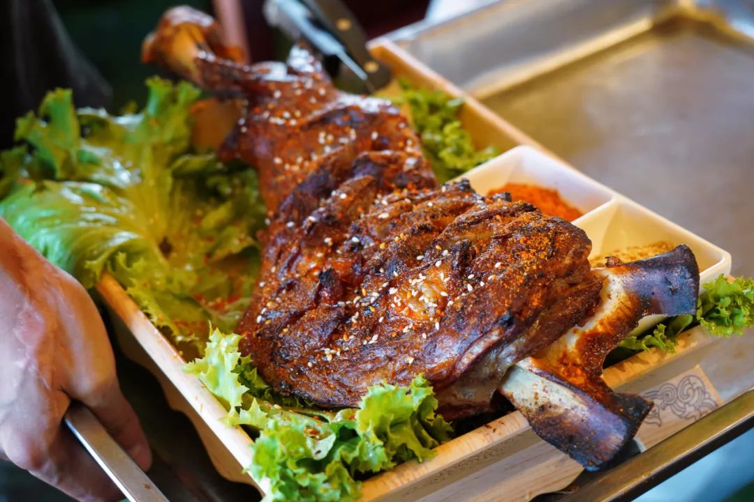 上了有十道菜吧,烤羊腿出现,我才展示出了我的战斗力,当日宰杀的羊,现烤的腿,羊骨焦香,炙肉喷香,肉质紧实,用刀碍手,索性直接上手撕,顺着纤维纹路撕扯,蘸着孜然和辣酱面,一嚼妙不可言,从此其他菜我都看不上了。