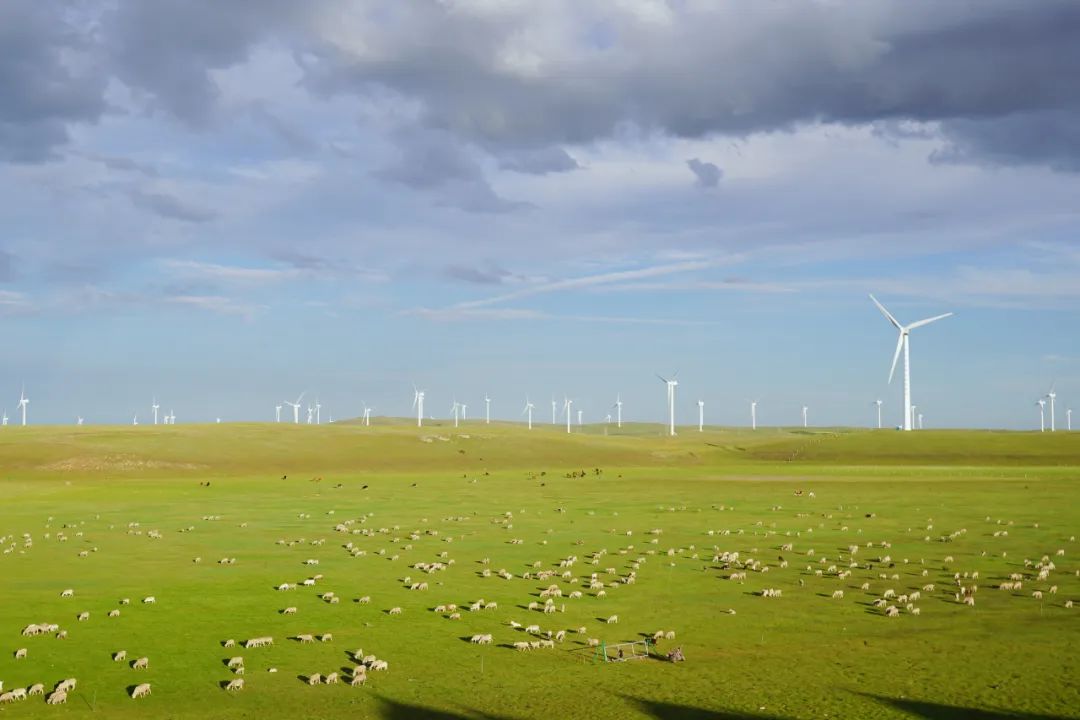 草原的风包裹住你了,身上的衣服在扇动。绿山坡富有曲线美,风车悠然自转,蓝天上点缀着纱一般的白云;
