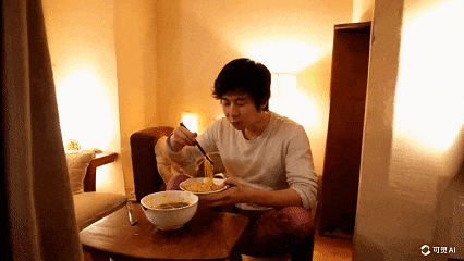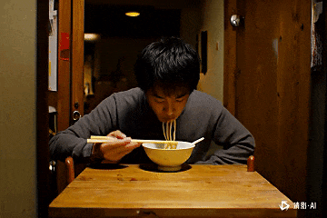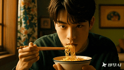 ↑即梦:第一帧很帅,光影也很自然。但依旧存在脸部和手部畸变的问题,以及模型明显不能够理解筷子的使用方式和面条的食用方式。
