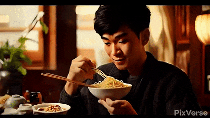 提示词:一个亚洲年轻男性在家里用筷子津津有味地吃一碗面条,风格真实,类似于电影《天使爱美丽》,环境舒适温馨,镜头逐渐拉近对准人物。
