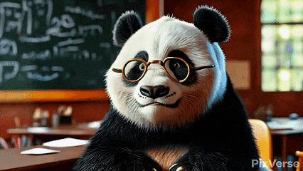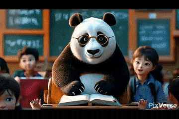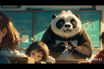 提示词(简单版):一头大熊猫戴着金边眼镜在教室黑板前讲课。