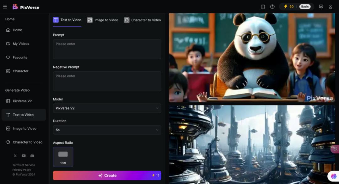 在页面布局上,PixVerse采用纯英文界面,右上角为账户等个人信息,左侧为功能性按钮,界面交互非常简单,可调节参数也并不多,主要是正向提示词、负提示词,模型选择,时长,画面比例等。