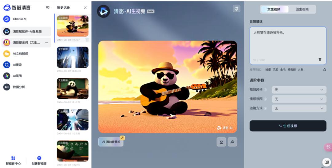 智谱清言将AI生成视频作为整个平台的一个子功能,嵌入到平台看板中,因此在界面布局上稍显杂乱。界面共分为四个部分,最左侧是平台的功能模块,再到历史记录、视频预览,对于生成视频可操作性不高。最右侧才是控制台,仅有提示词输入,视频风格、情感氛围和运镜方式可以选择,需要用户自行探索部分隐性功能,有一定学习门槛。