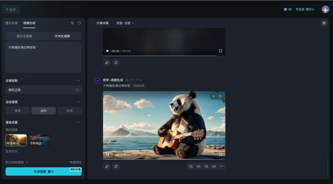 即梦模型主界面简洁,总体色调和布局承袭剪映的风格,分为左侧调试和右侧预览两部分,调试部分与其他模型大同小异。在右侧预览部分,对生成的视频可以实现延长时长、对口型、补帧、提升分辨率等会员功能,用于对生成视频的调整,也符合用户工作流习惯。
