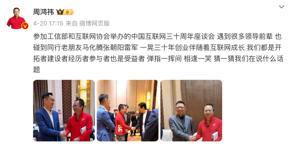 2024 年 4 月 20 日,恰逢中国全功能接入国际互联网 30 周年。于是,在一场由中国互联网协会组织的「中国互联网 30 周年发展座谈会」上,周鸿祎与马化腾、雷军、张朝阳、齐向东等互联网大佬齐聚一堂。