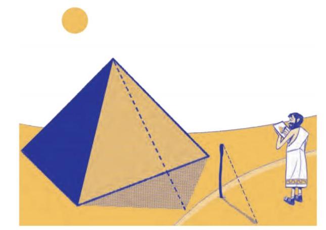 说到这里,你可以想出泰勒斯是怎么应对金字塔测高问题的了吧——和解决方尖碑测高问题是一样的。
