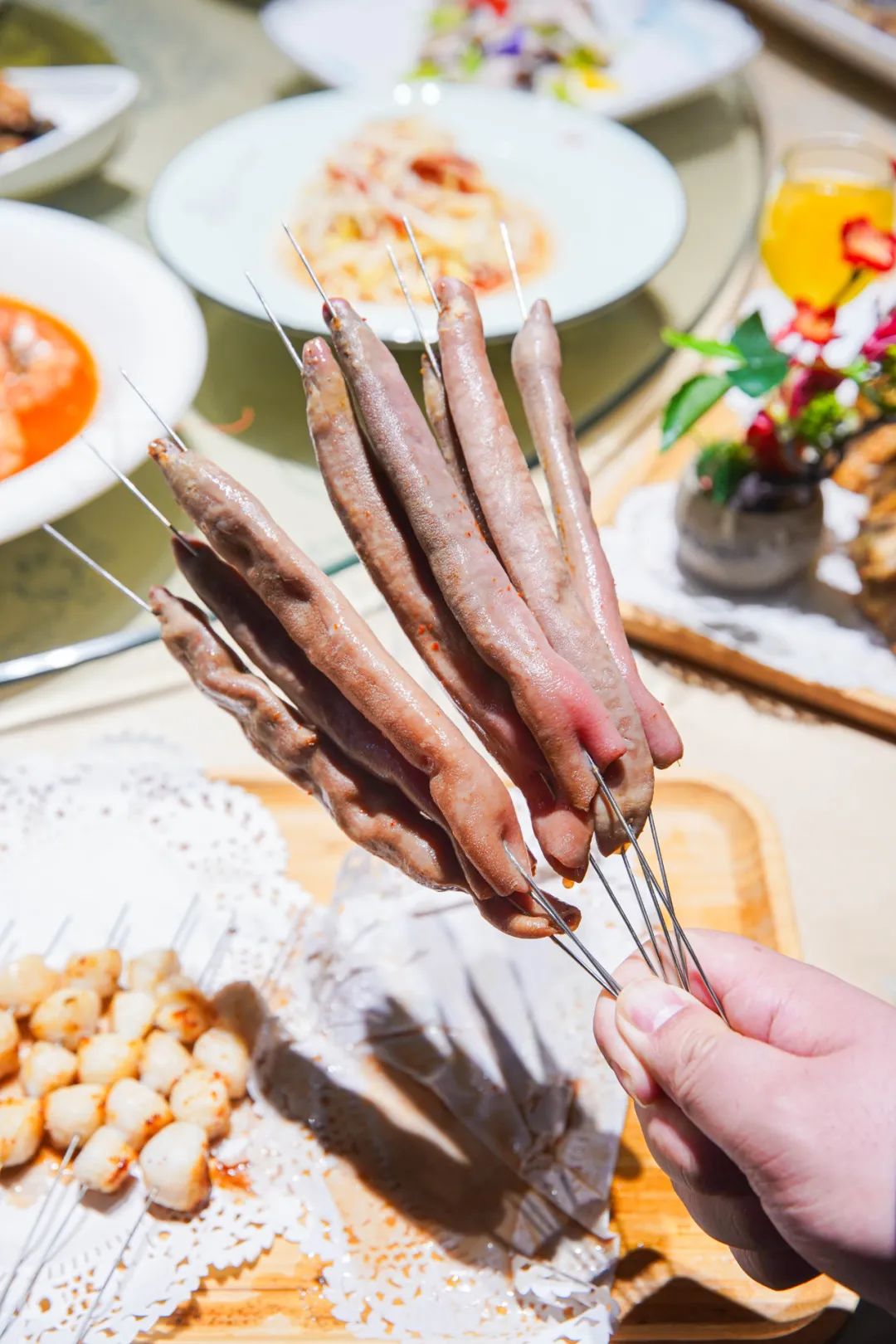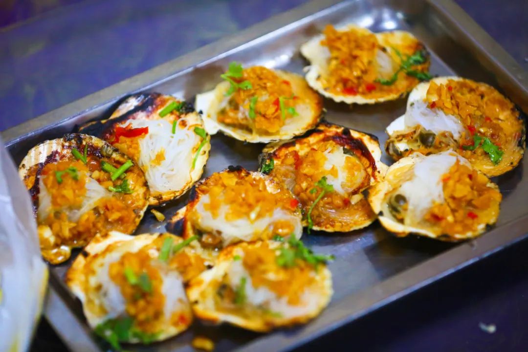 白嫩鲜甜的扇贝丁、柔软多汁的鸟贝以及瓷蛤头、天鹅蛋等贝类做成烧烤又是另一番风味。只需一点点盐和辣椒面,就可以激发其最大鲜味。