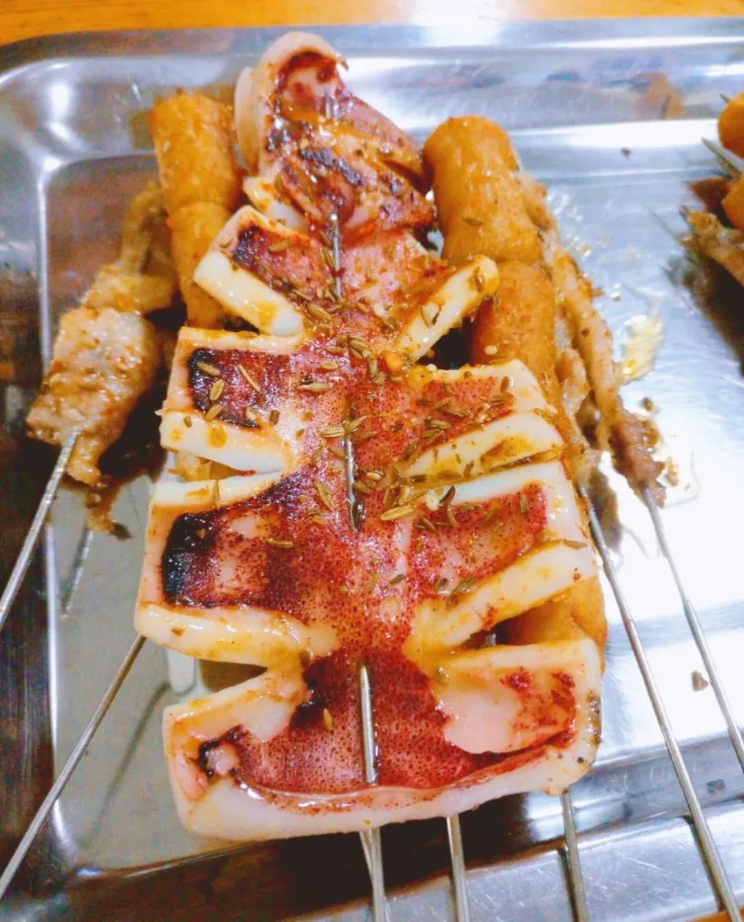烤鱿鱼个大实惠,烟台人吃鱿鱼会细分为不同部位:鱿鱼板肉厚味美、鱿鱼头有嚼劲、鱿鱼嘴Q弹紧实……每个部位都好吃,艮啾啾的口感独一无二!