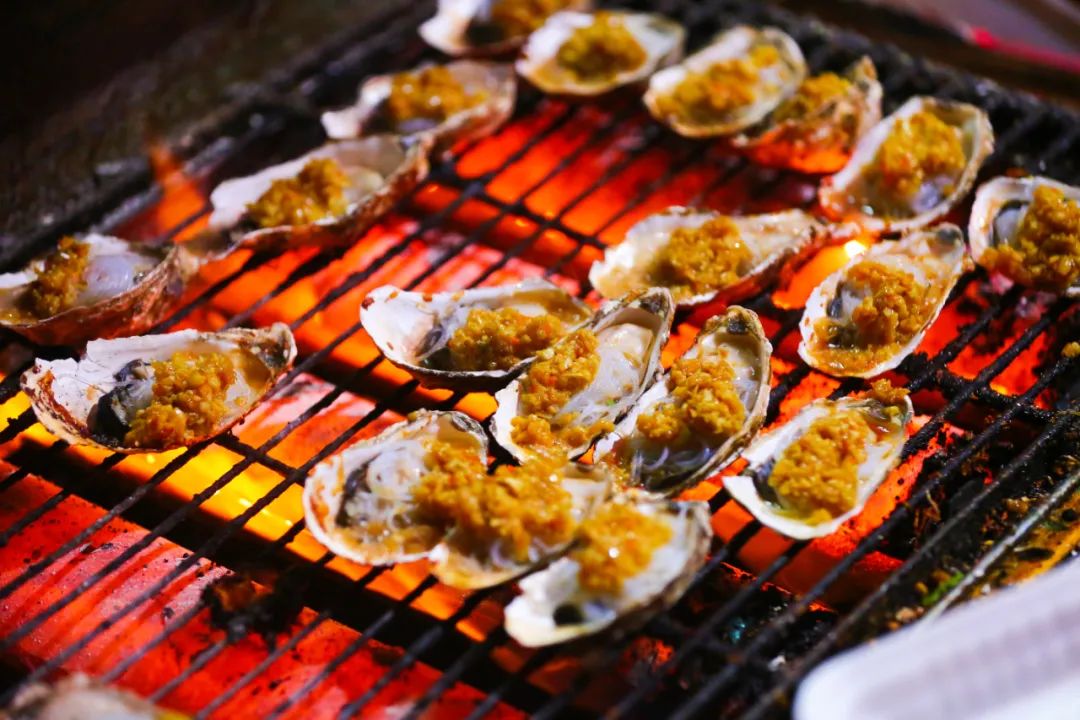 还有风味十足的蒜蓉粉丝扇贝和烤海蛎子!一个个连壳带肉一起送上烤架,不一会儿就有汤汁冒出来,与浓郁的蒜香完美交融,先喝汤再吃肉,鲜到掉眉毛!
