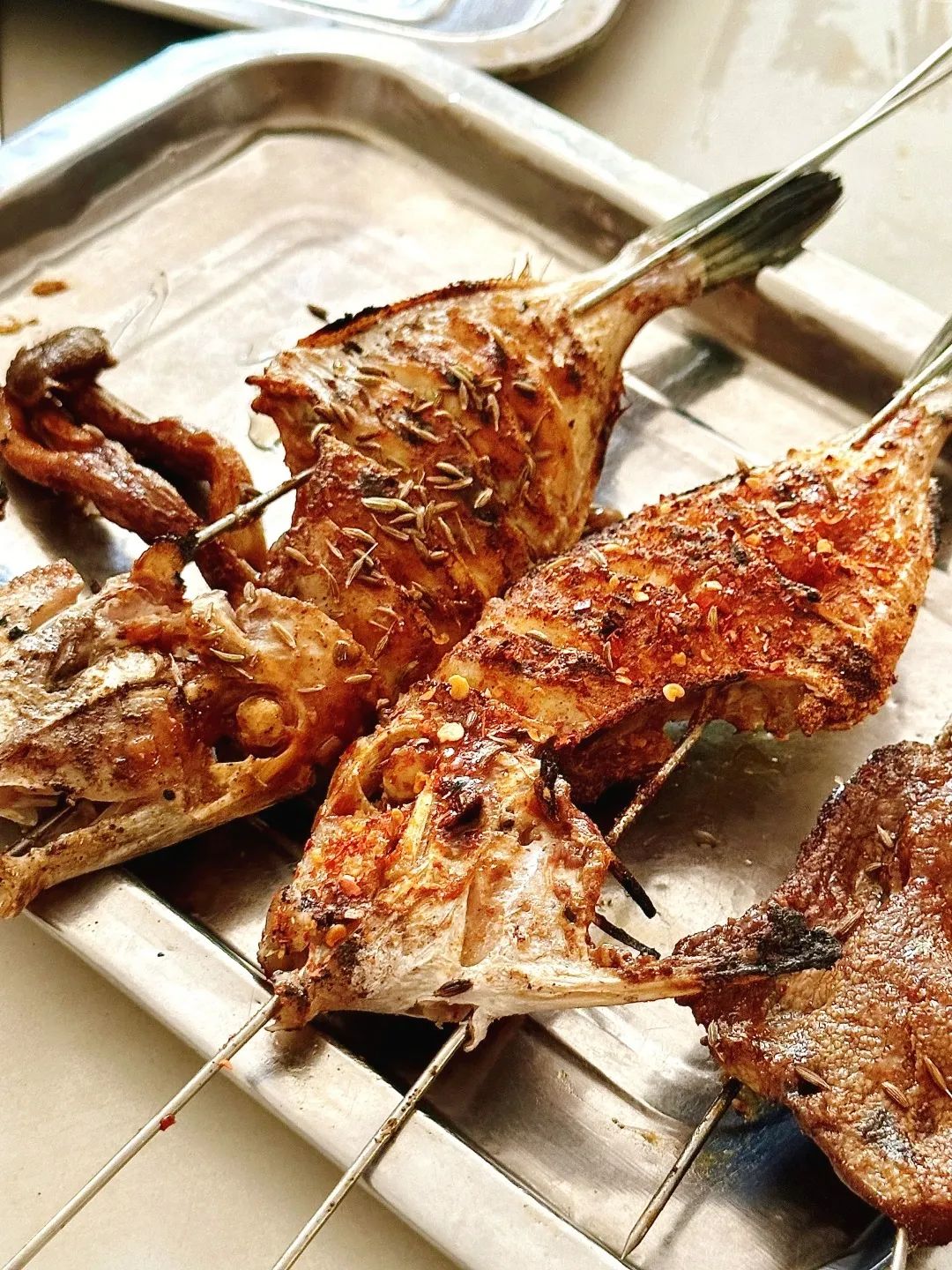 提到各类海鲜烧烤,烤鱼自然必不可少。马步鱼干刷上一层蜜酱味道鲜甜,外皮烤到微焦,鱼肉薄薄一层柔韧有嚼劲,是不少烟台人的心头好;还有烤扒皮狼,鱼皮焦香酥脆,鱼肉鲜嫩紧实超级好吃!