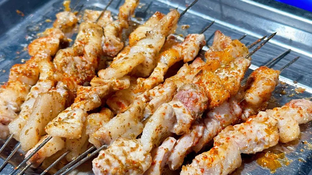 在众多肉类里,烟台人偏爱烤五花肉。肥瘦相间的肉串在烤架上滋滋冒油,嚼在嘴里浓香四溢、肥而不腻,无愧为烧烤界的“扛把子”。