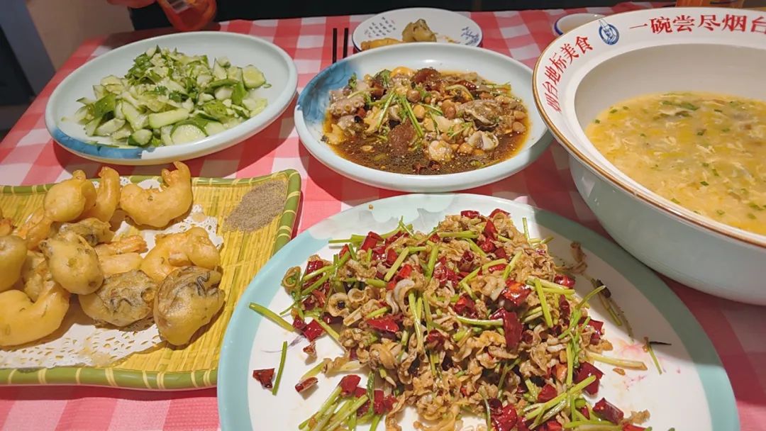 温拌扇贝边是烟台特色,辣炒花蛤、捞汁钉螺、腌螃蟹钳、老醋六样、拍黄瓜等爽口配菜,更能让你体会到生活在烟台的幸福感。