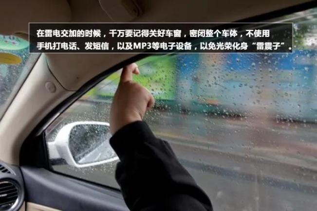 在雷雨交加的时候,不使用手机等电子产品,不使用车内的收音机,一些老的车型外置天线会有导电作用,也请在雷雨天到来前提前把它收起来以免造成导电。09
